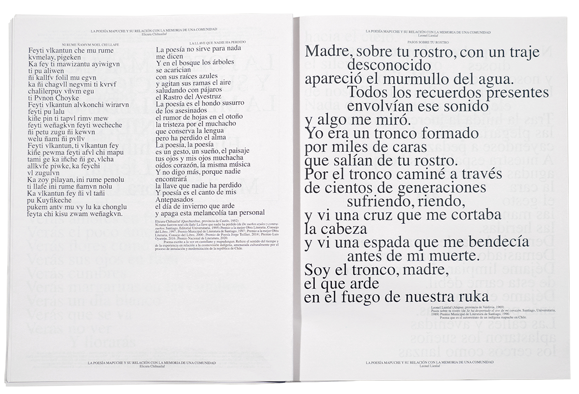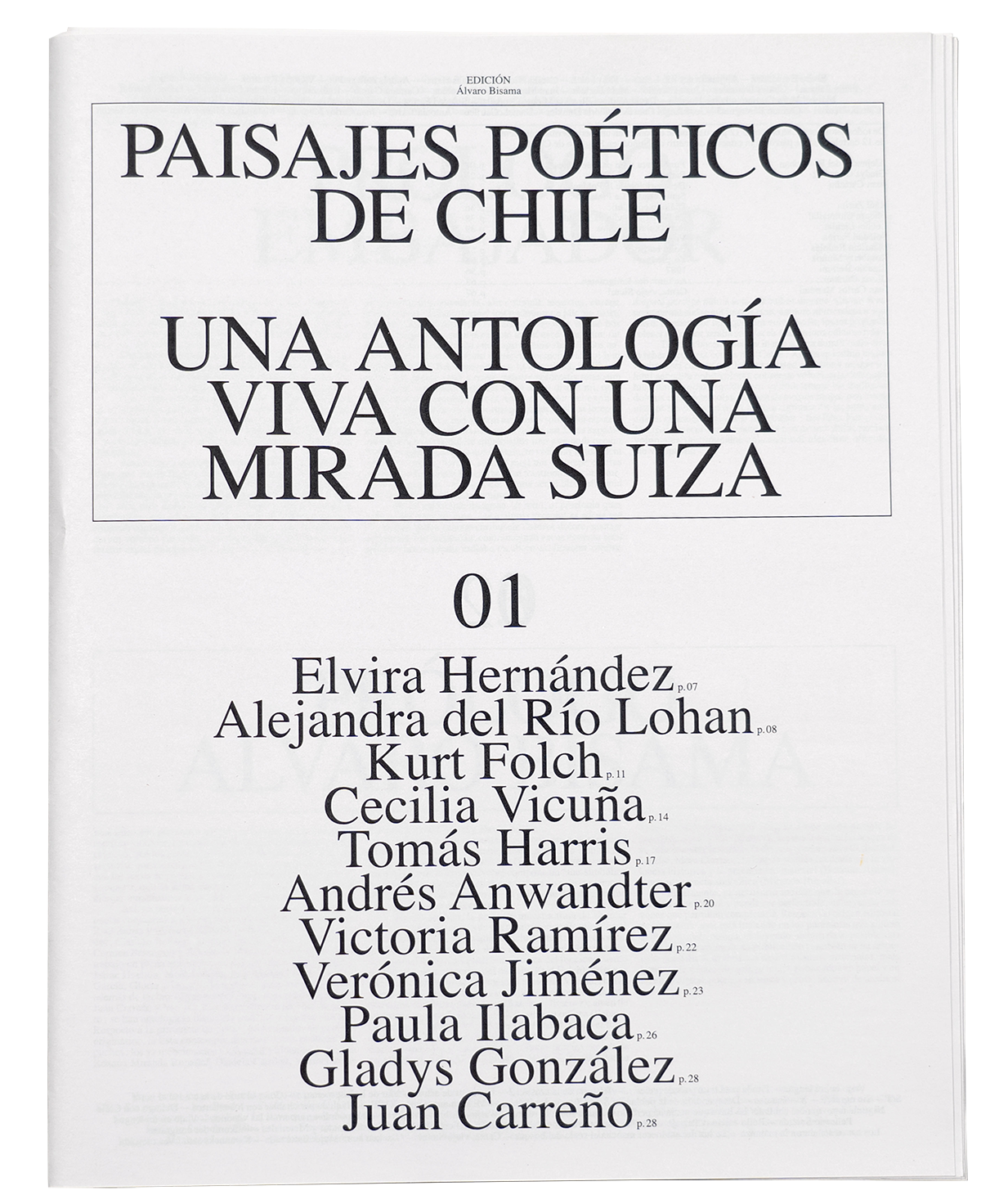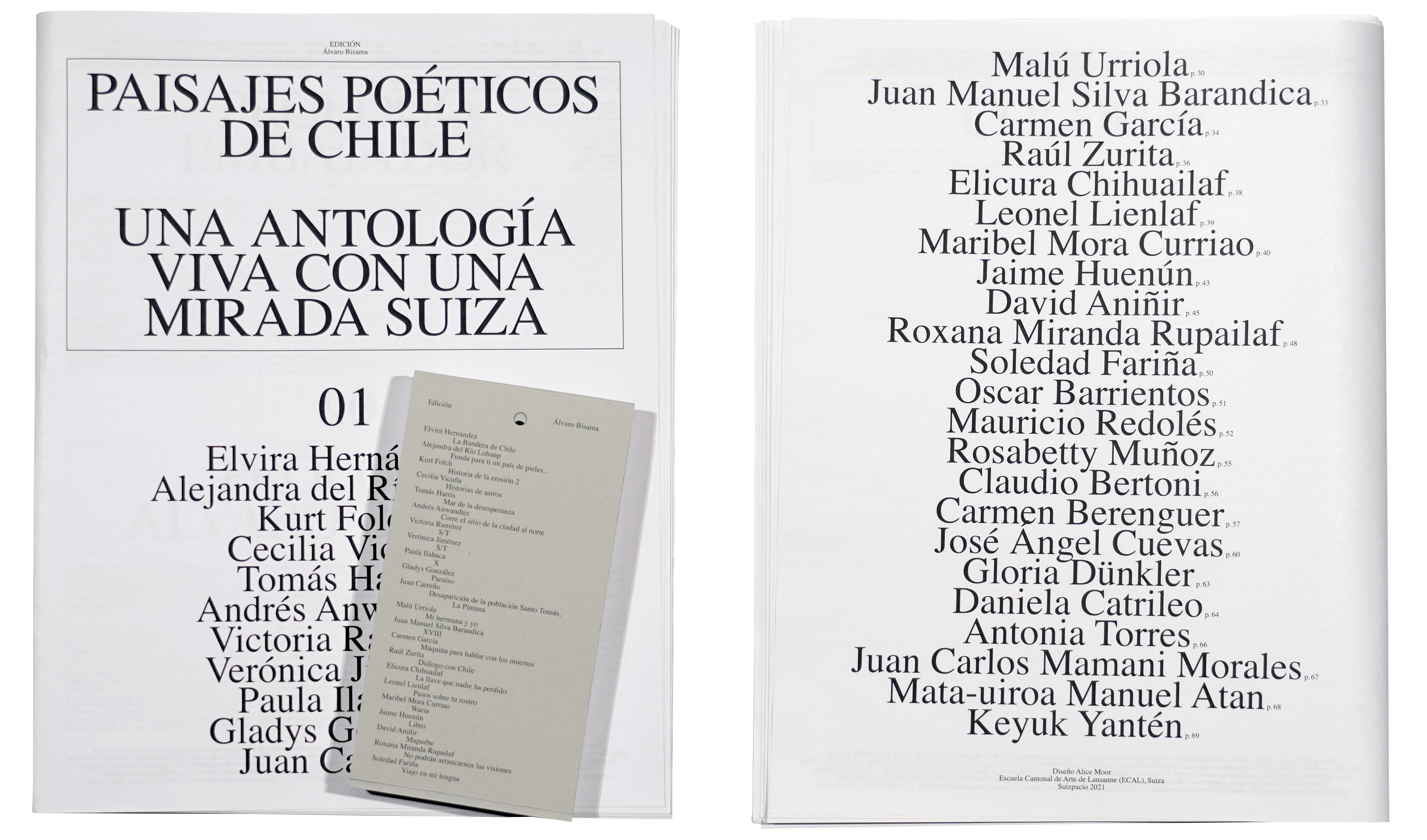 Collection of Chilean poems by contemporary authors. Two different types of format, Tabloid newspaper and pocket format with detachable pages, which can be given as gifts. Work done at écal for the Swiss Embassy in Chile.