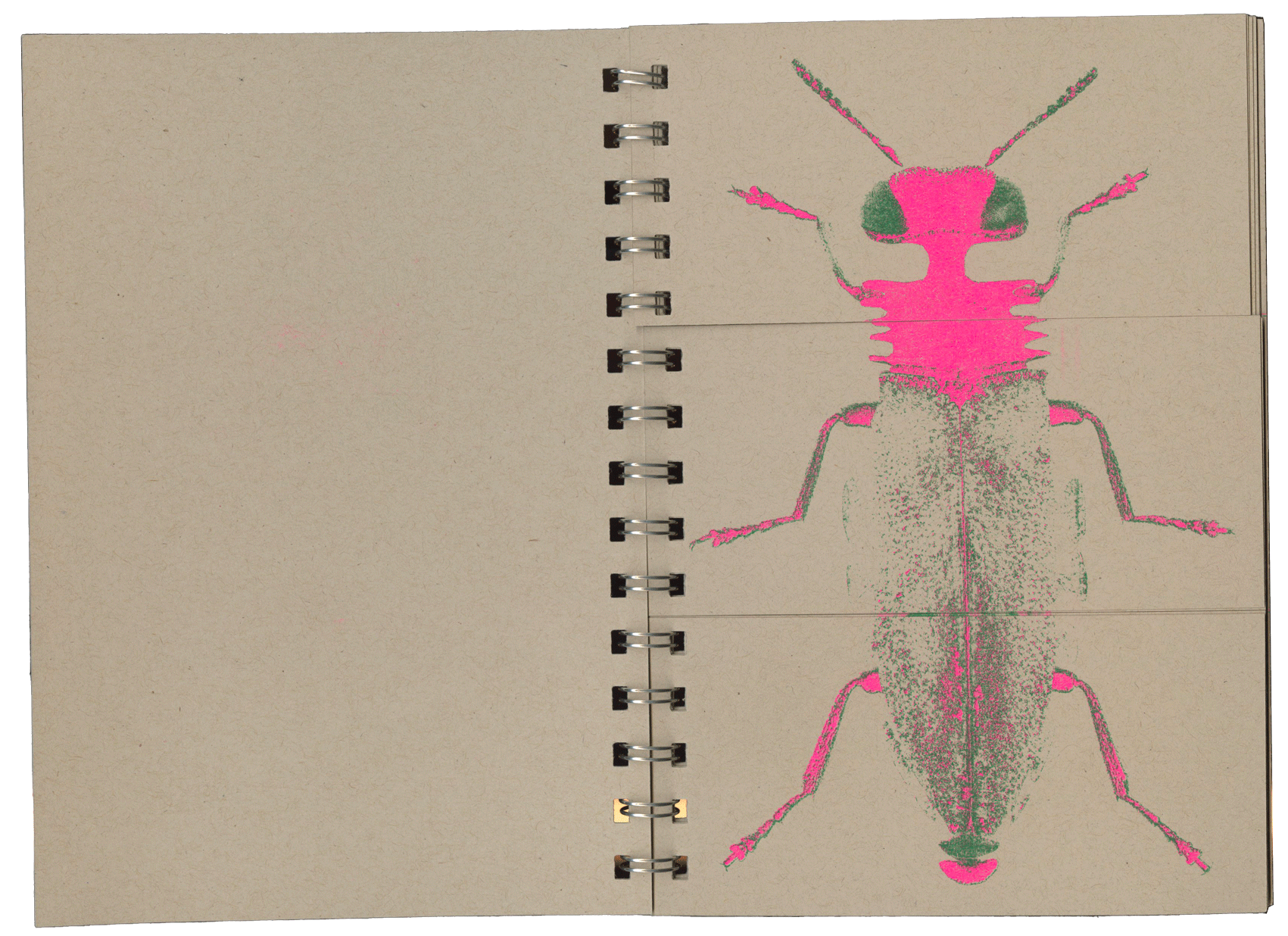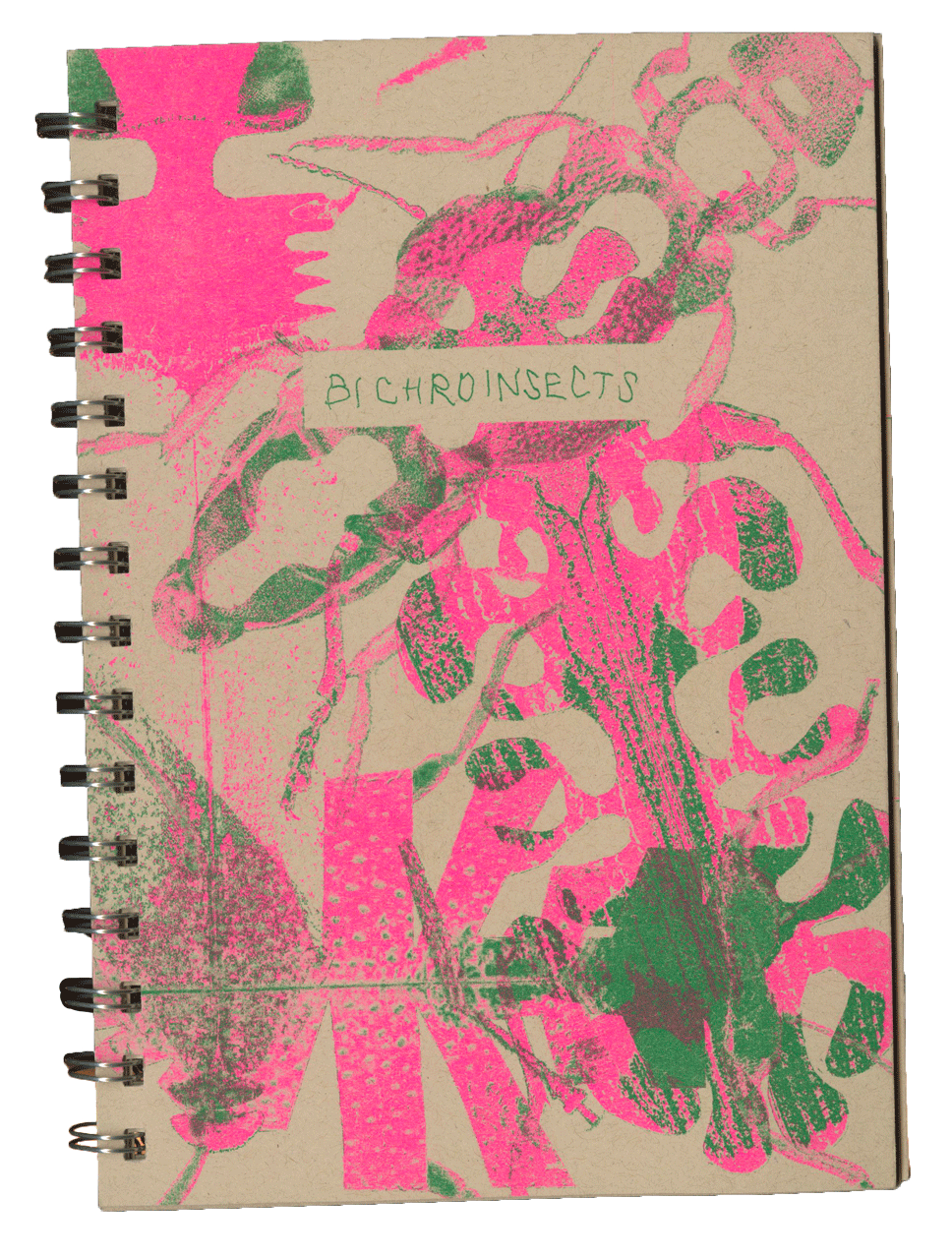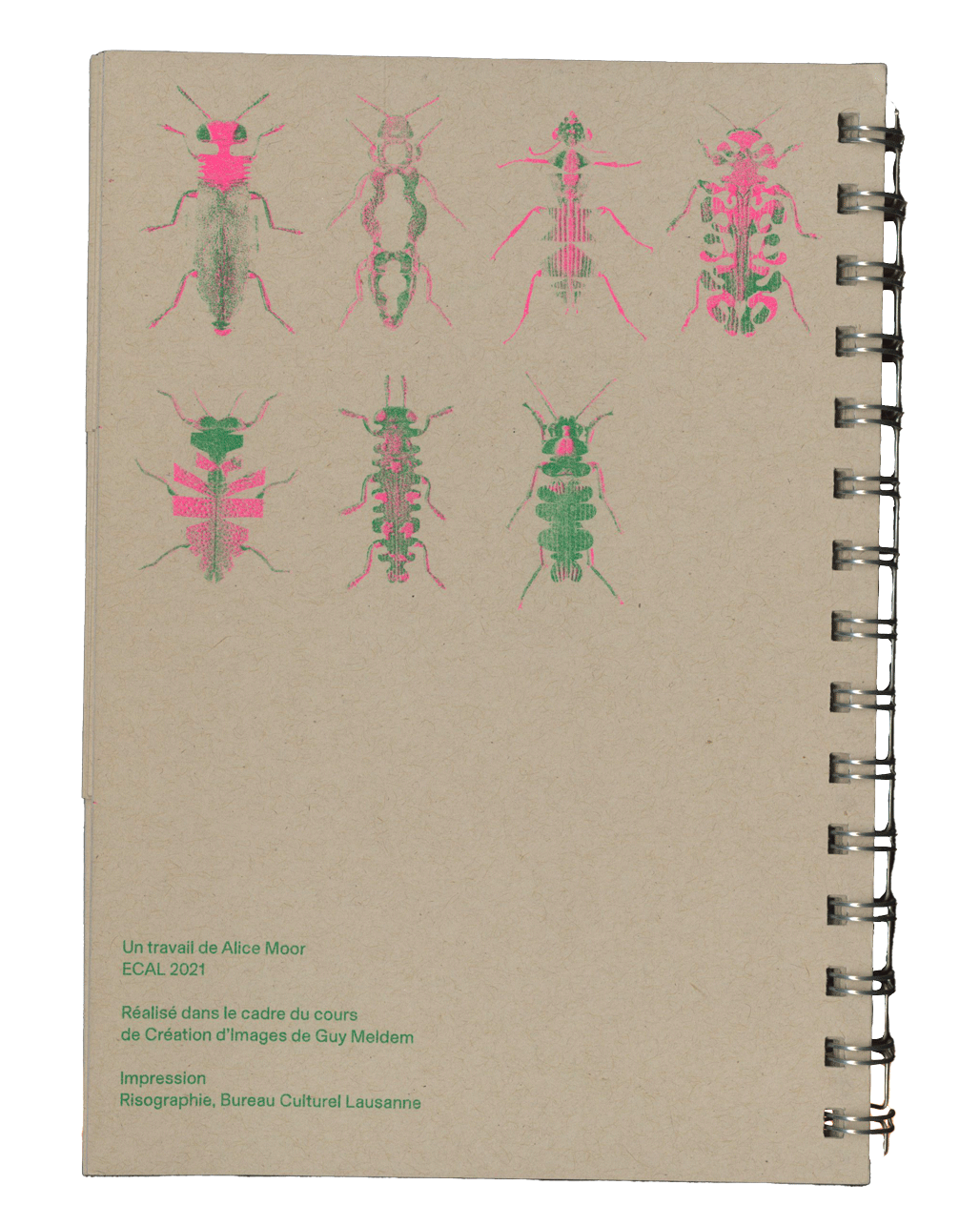 Children's book printed in two colours using the risography technique. I decided to invent 7 weird insects using the collage technique, and then to create a book of exquisite corpses