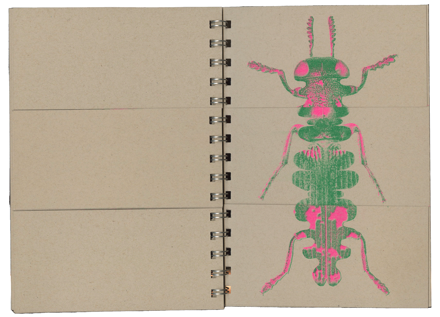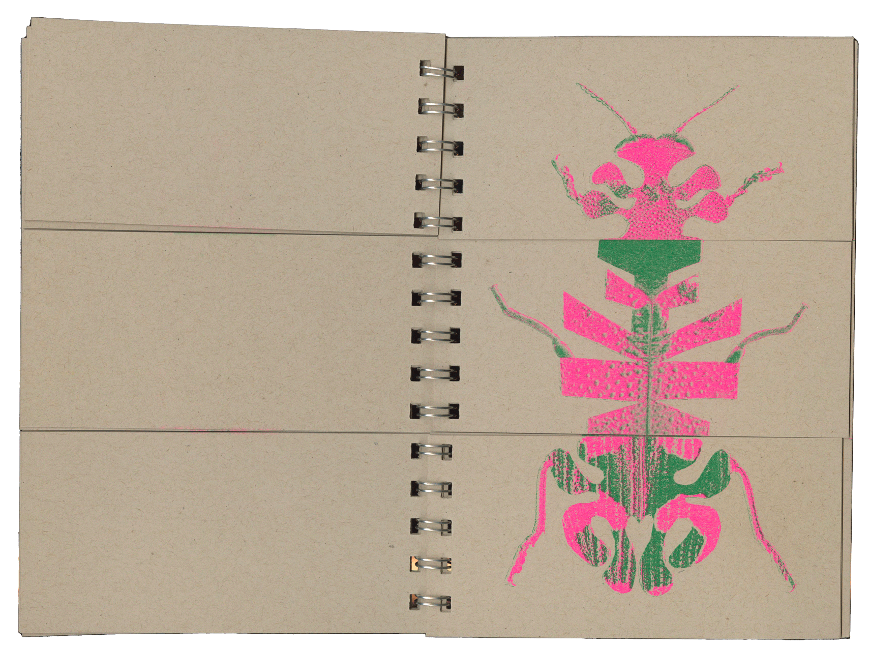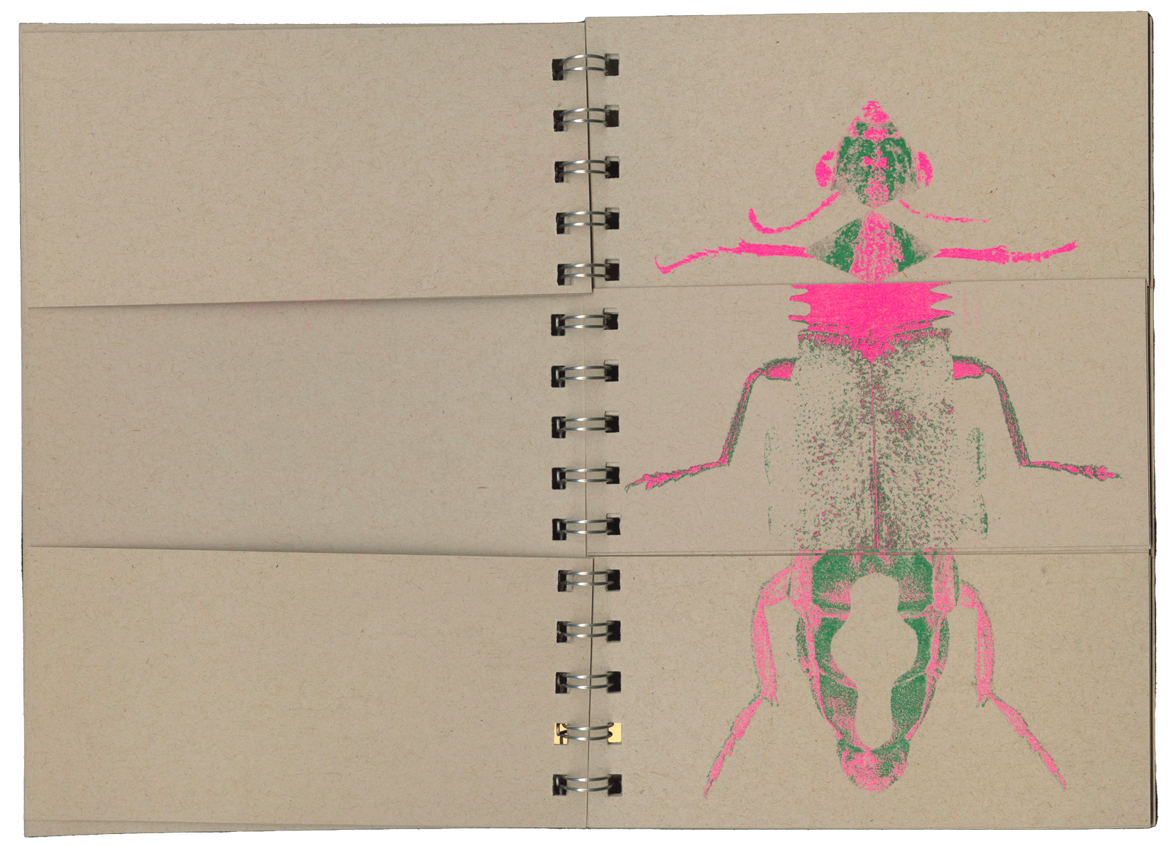 Children's book printed in two colours using the risography technique. I decided to invent 7 weird insects using the collage technique, and then to create a book of exquisite corpses