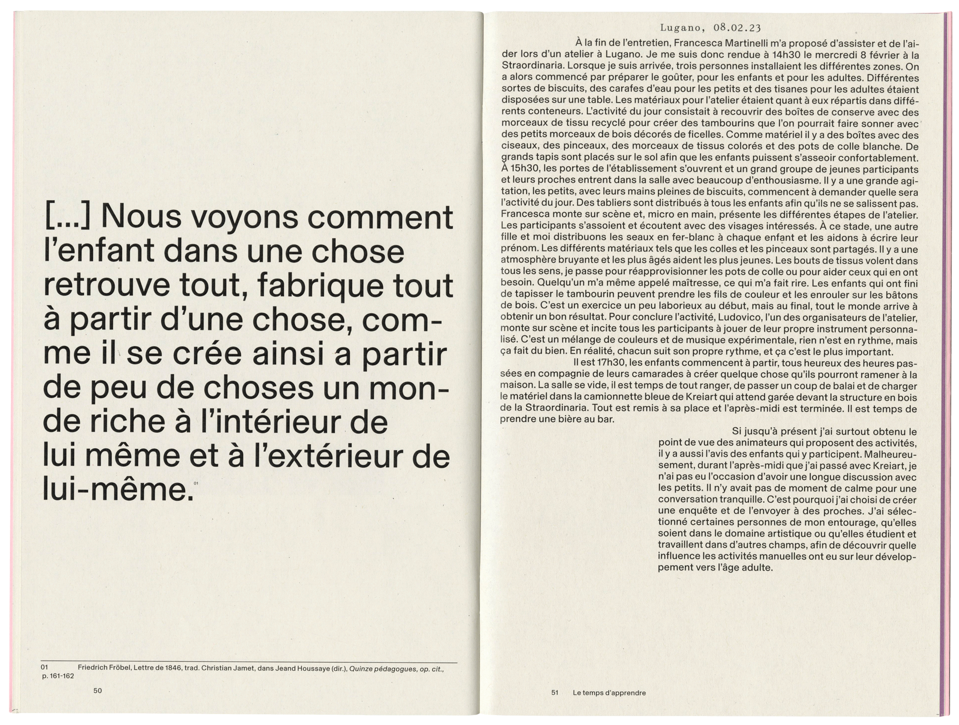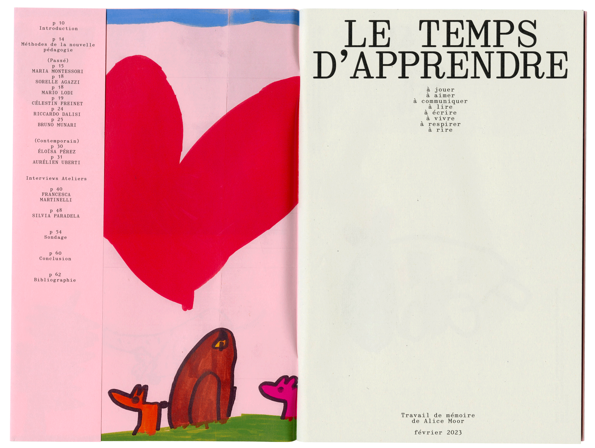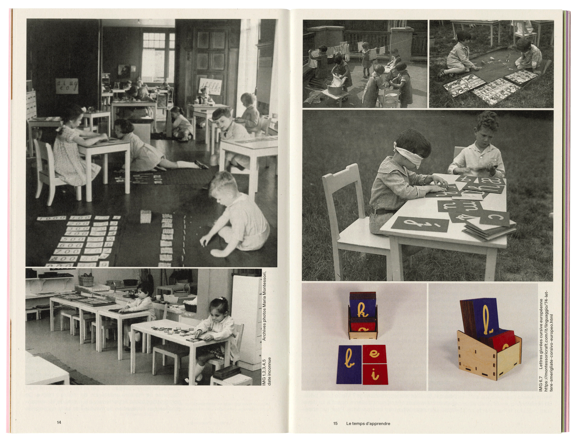 Le Temps d'apprendre is a research project on the methods of the new pedagogy developed in the last century and on current projects linked to children's manual skills. This work is based on a theoretical approach supplemented by interviews and surveys that give concrete form to the subject. The aim is to use the graphic arts to re-examine the various mechanisms that contribute to children's development.