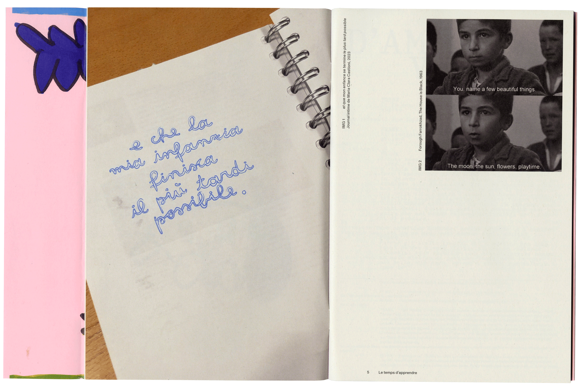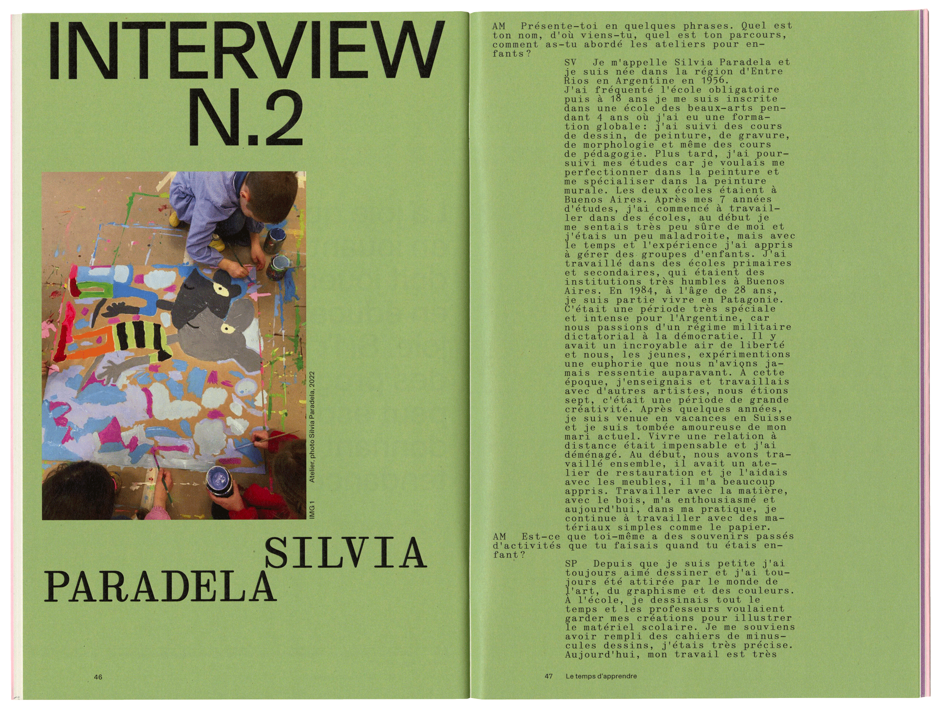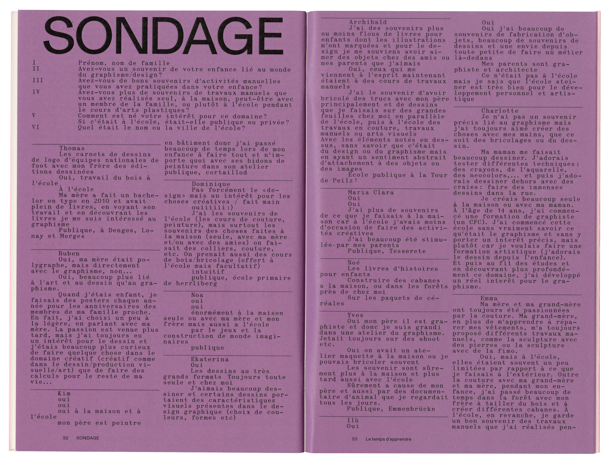 Le Temps d'apprendre is a research project on the methods of the new pedagogy developed in the last century and on current projects linked to children's manual skills. This work is based on a theoretical approach supplemented by interviews and surveys that give concrete form to the subject. The aim is to use the graphic arts to re-examine the various mechanisms that contribute to children's development.