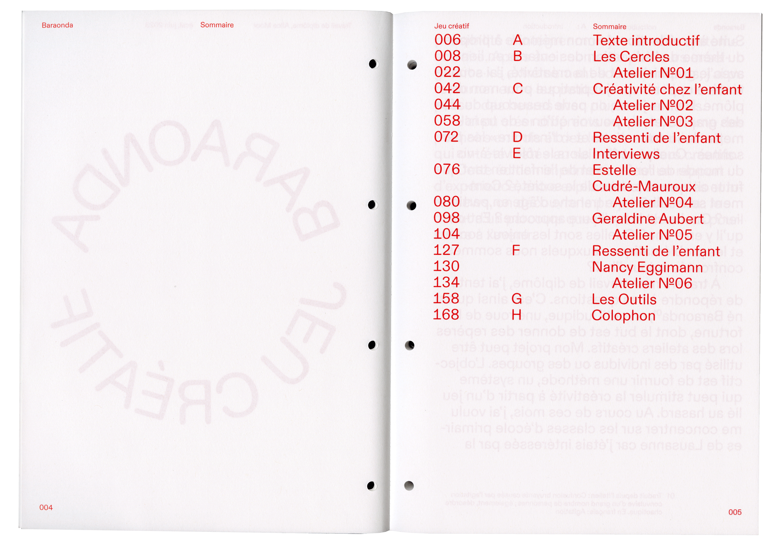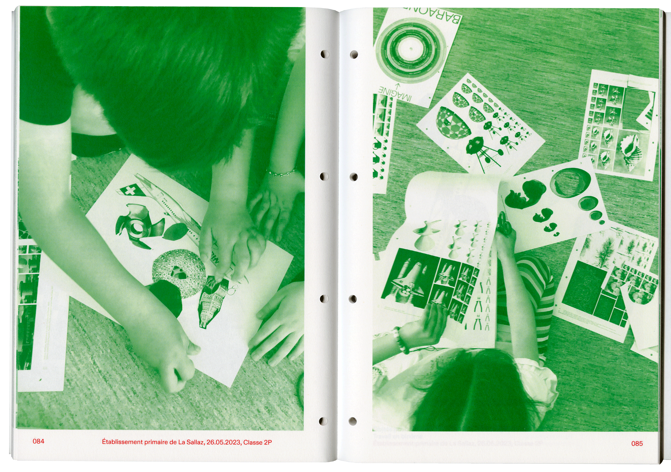 I tried to answer these questions through my diploma work, developing the Baraonda project, which consists of a playful system for running creative activities. The workshop consists of manipulating a wheel of fortune made up of several circles that determine the different characteristics and rules that will be put in place. Based on 4 themes (personal qualities, dream job, family, objects to save the planet), I manage to tackle several topical subjects. At the beginning of each workshop, there's a moment for discussion, where we talk about ecology, gender issues and self-confidence. Nine stages have been devised for the activity, from the widest circle to the narrowest. These stages first determine a theme and a medium, then the technique, the different materials, the colours and so on. You can use all the circles or work with a partial selection. In addition to the series of circles, I have developed various materials to support the workshops: wooden stencils, a collection of images and stickers. The development of the project and some of the results of the activities carried out in primary school classes in Lausanne have been brought together in a printed edition. All the materials are brought together in a cloth-covered cardboard box.